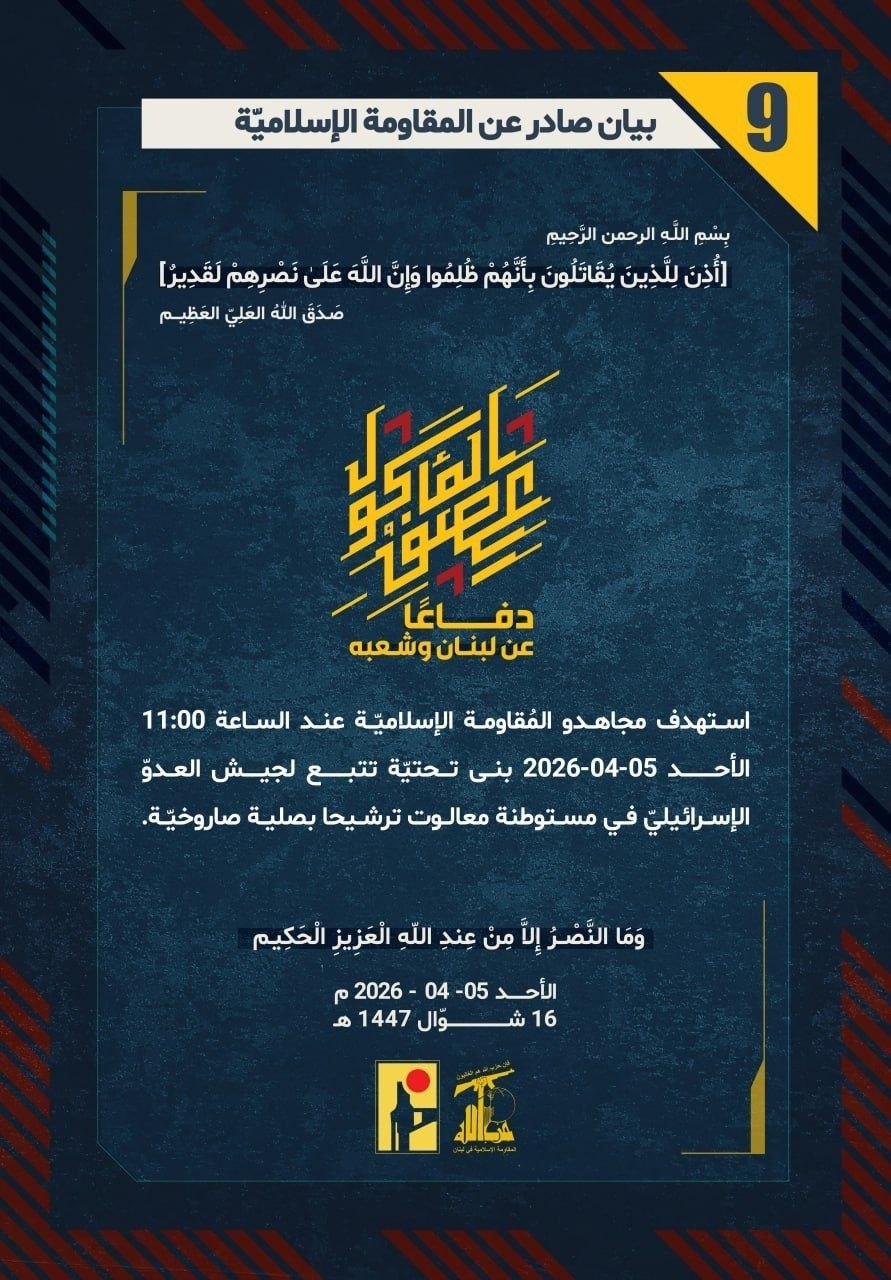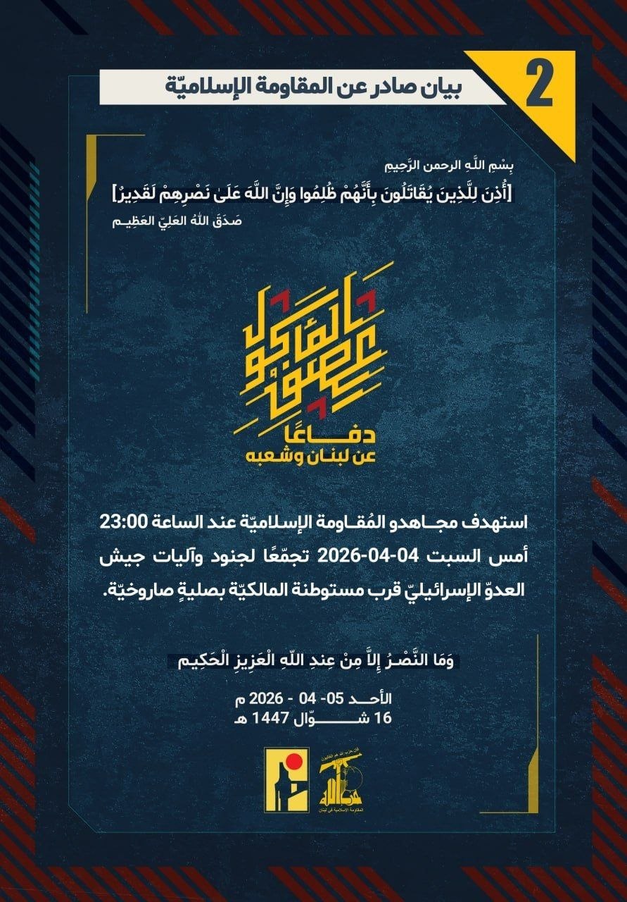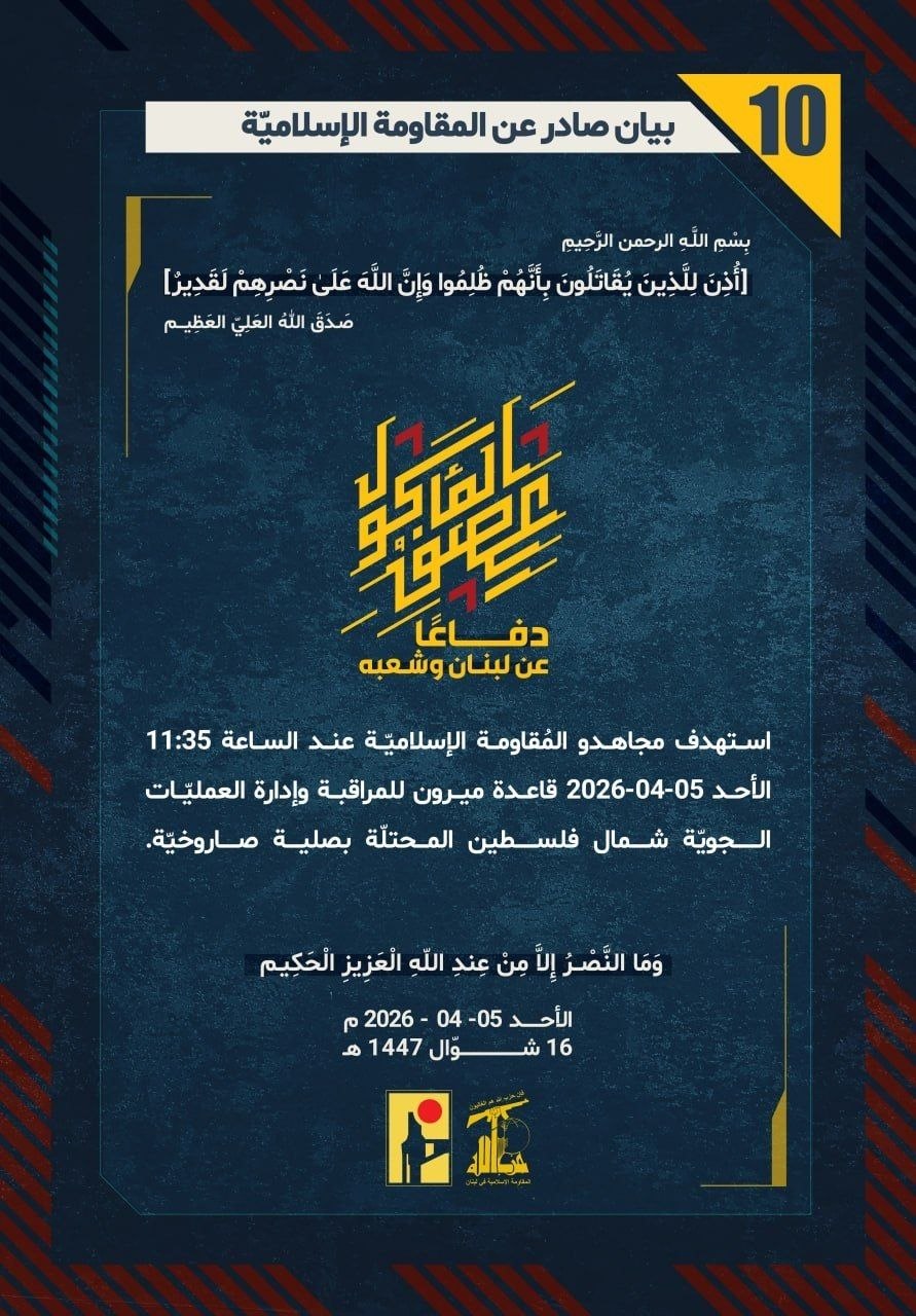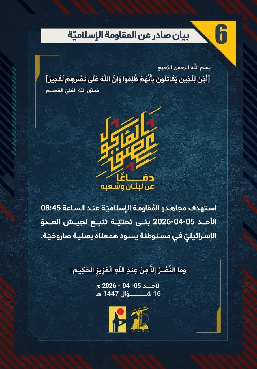 أما البيان السادس للمقاومة الإسلامية، فقد تضمن استهداف حزب الله بنى تحتية تتبع لجيش العدو الإسرائيلي في مستوطنة يسود همعلاه بصلية صاروخية، مؤكدين في بيانهم السابع استهداف موقع كفرسولد بصلية صاروخية.