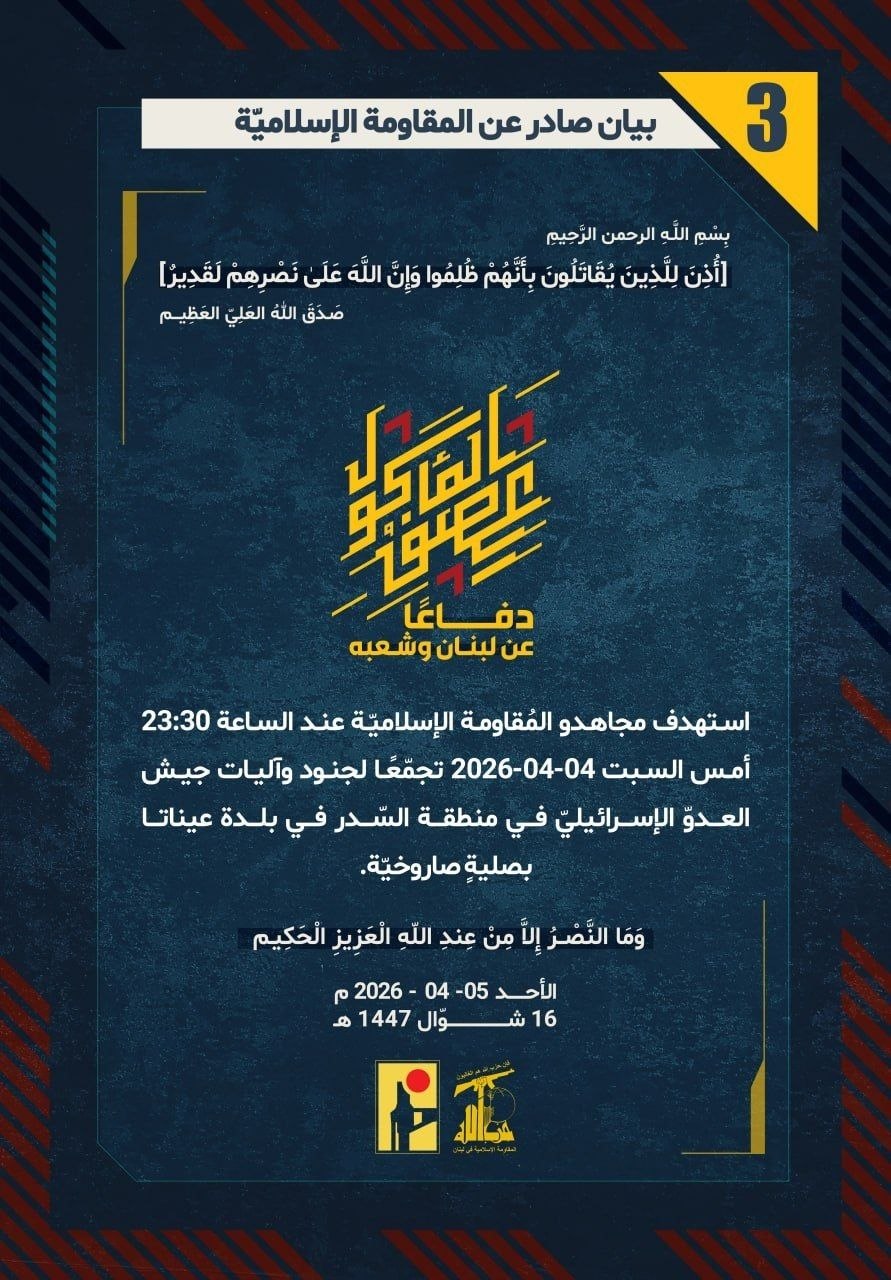 وأفادت المقاومة الإسلامية في لبنان، خلال الساعات (24) الماضية، بتنفيذ سلسلة عمليات عسكرية استهدفت تجمعات لجنود وآليات العدو داخل البلدة ومحيطها، مؤكدة أن العمليات شملت قصفاً صاروخياً استهدف تجمعاً للقوات المعادية في تلة فريز بمنطقة عيناتا، إلى جانب تنفيذ ضربات مدفعية وصاروخية مكثفة طالت مواقع وتجمعات أخرى داخل البلدة ومحيطها.