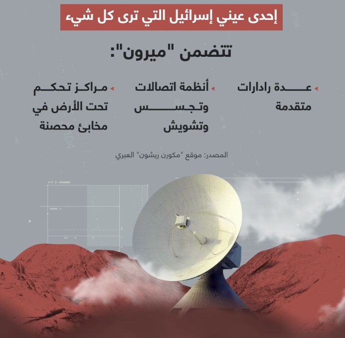 المسيرة نت| خاص: تُشكل قاعدة ميرون الواقعة بمنطقة الجليل فوق جبل ميرون المسمى بـ "الجرمق" على الأراضي الفلسطينية المحتلة منذ عام 1948م، على ارتفاع 1208 م، وتبعد حوالي 8.5 كم عن الحدود اللبنانية - العين العسكرية الشمالية لكيان العدو الإسرائيلي، والمركز العصبي لمهام الرصد الراداري والتشويش الإلكتروني، وإدارة وتنسيق وتنظيم عمليات التحكم الجوية باتجاه سوريا ولبنان وتركيا وقبرص والقسم الشمالي من الحوض الشرقي للبحر الأبيض المتوسط.