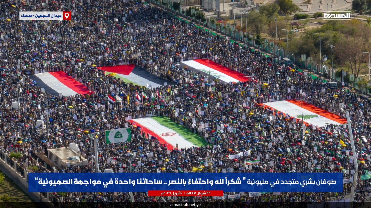 المسيرة نت | خاص: لا تزال الساحة اليمنية محافظة على زخمها الجماهيري المليوني منذ طوفان الأقصى وحتى الآن، استجابة للسيد القائد عبد الملك بدر الدين الحوثي، يحفظه الله، وتأكيداً على ثبات الموقف المساند للقضية الفلسطينية ووحدة الساحات المتمثلة في محور المقاومة، حيث شهدت مئات الساحات اليمنية، أمس الجمعة، حشوداً غفيرة تحت عنوان: "شكراً لله واحتفاءً بالنصر.. ساحاتنا واحدة في مواجهة الصهيونية".