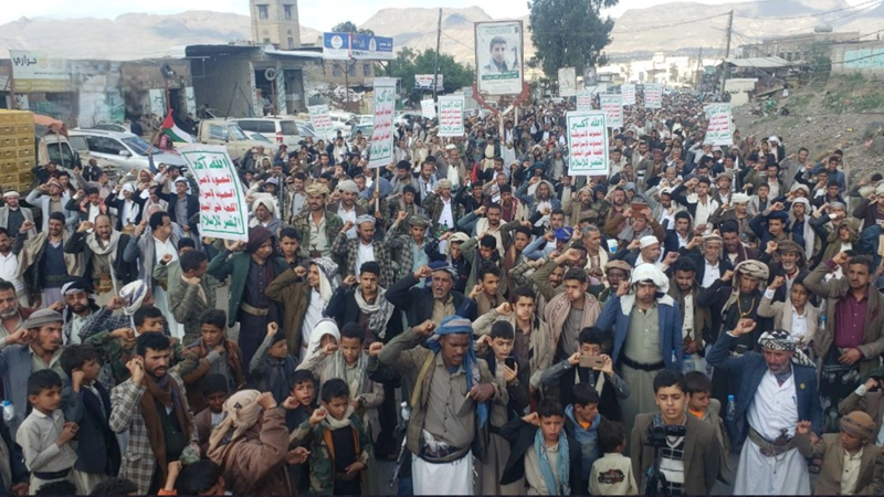 ورفع المشاركون في المسيرات والوقفات، أعلام اليمن وفلسطين ولبنان وإيران، مرددّين هتافات النصر، وشعار البراءة من أعداء الله اليهود والأمريكان.