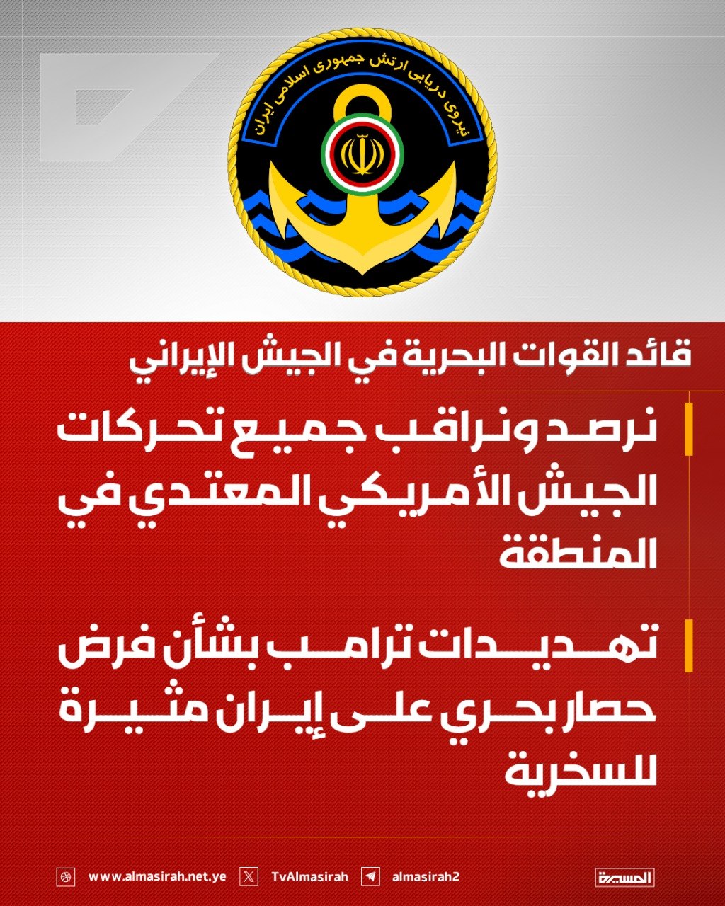 وأعلن قائد القوات البحرية في الجيش الإيراني، شهرام إيراني، أن قواته تتابع عن كثب تحركات الجيش الأمريكي المعتدي في المنطقة، مؤكداً أن أي محاولة لفرض واقع عسكري جديد ستُقابل بإجراءات مناسبة، تعكس مستوى الجاهزية والاستعداد لدى القوات الإيرانية.