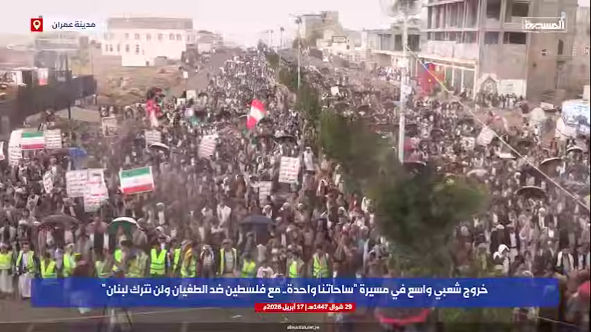 مدينة #عمران | خروج شعبي واسع في مسيرات «ساحاتنا واحدة.. مع فلسطين ضد الطغيان ولن نترك لبنان»#مع_فلسطين_ولبنان#ساحاتنا_واحدة pic.twitter.com/nLoLpIwgr8— شاهد المسيرة (@ShahidAlmasirah) April 17, 2026
