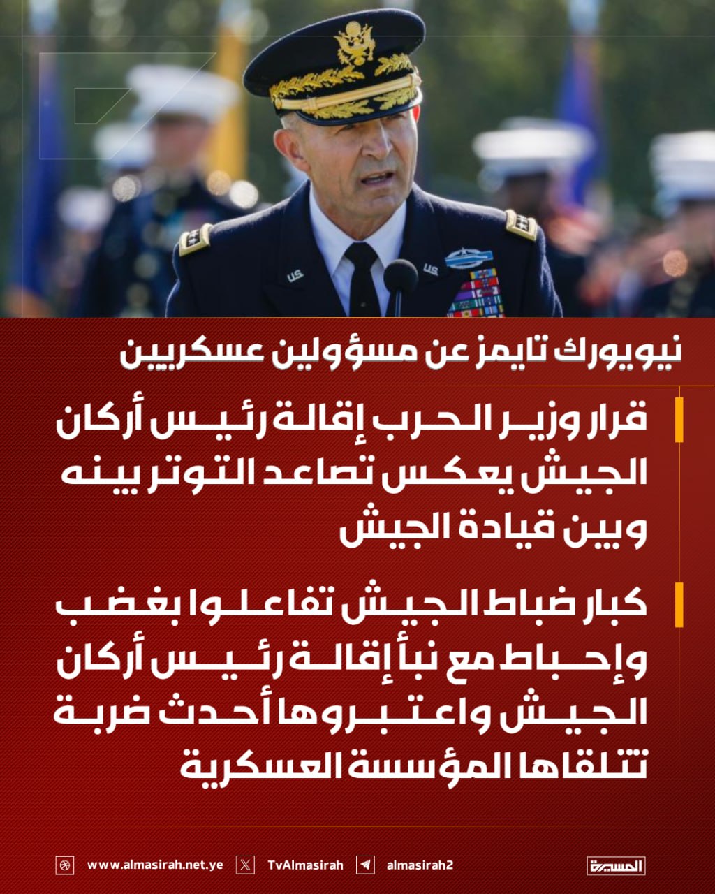 المسيرة نت | محمد ناصر حتروش: تشهدُ الولايات المتحدة انهياراتٍ غير مسبوقة في بنية القيادة العسكرية، بما يكشف للعالم أن هيكل البنتاغون لم يعد يحتفظ بالصلابة التي روج لها طيلة الأعوام السابقة، في ظل تآكلٍ متسارع لقواه من الداخل تحت وطأة العمليات النوعية الاستراتيجية التي ينفذها محور المقاومة.-