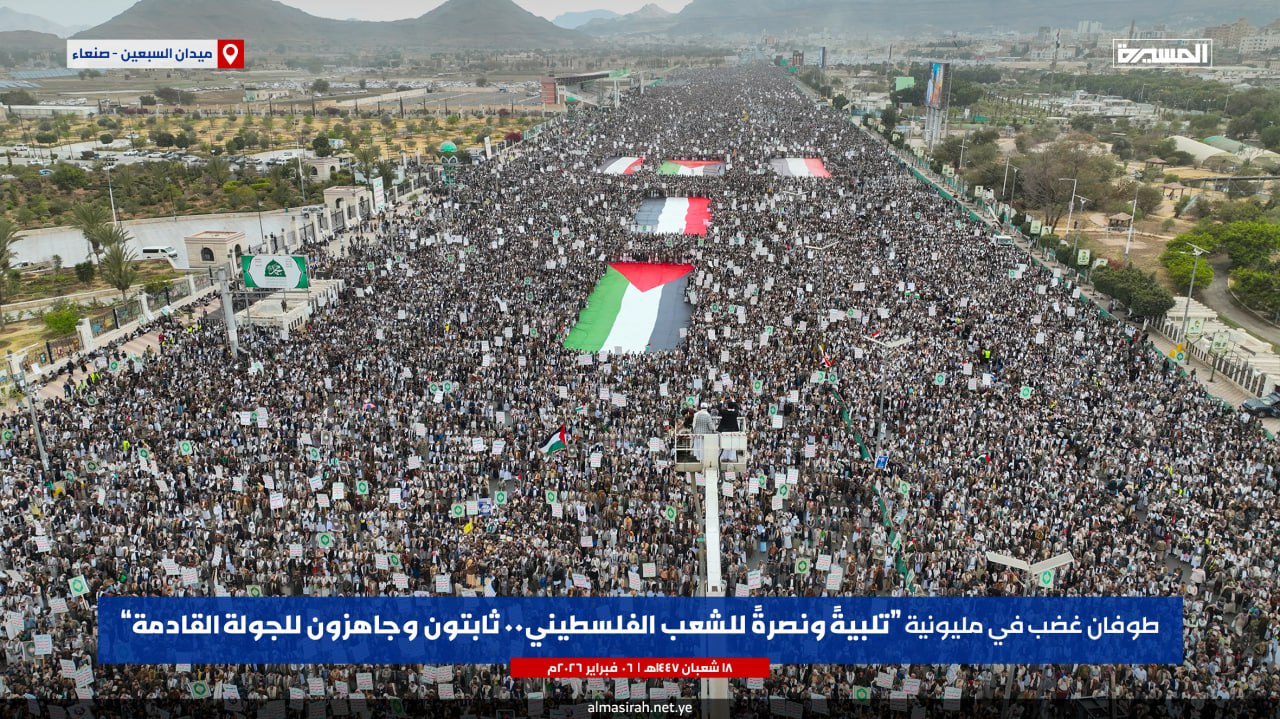 🔵 تغطية ميدانية | مليونية (تلبيةً ونصرةً للشعب الفلسطيني.. ثابتون وجاهزون للجولة القادمة) بـ #ميدان_السبعين في #صنعاء | 18-08-1447هـ 06-02-2026م