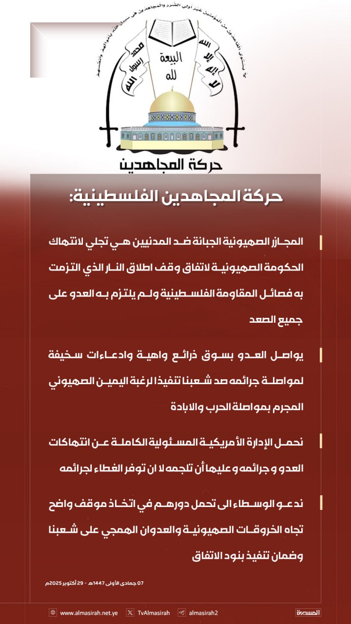 العنوان:حركة المجاهدين: المجازر الصهيونية تجلٍّ لانتهاك الاحتلال اتفاق وقف إطلاق النار