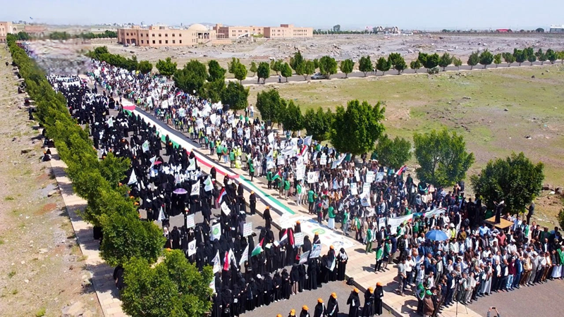 مسيرة حاشدة في جامعة صنعاء بعنوان "رغم الإرجاف والعدوان.. مع غزة ثابتون ومستنفرون"