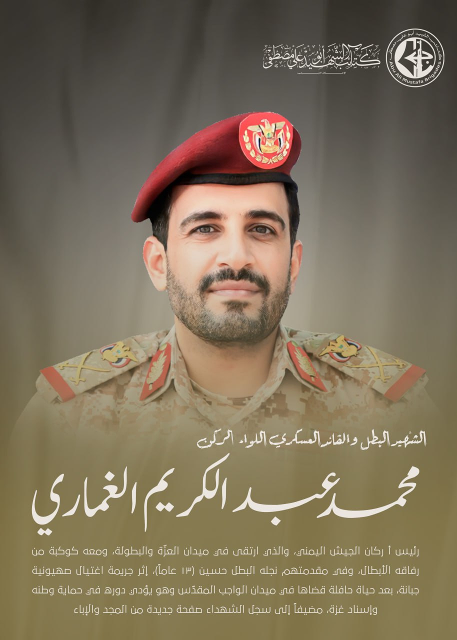 الوصف:المسيرة نت| متابعات: نعت الجبهة الشعبية لتحرير فلسطين القائد العسكري البارز اللواء الركن محمد عبد الكريم الغماري، رئيس أركان الجيش اليمني، الذي "ارتقى في ميدان العزّة والبطولة دفاعاً عن وطنه وإسناداً لغزة"، ومعه كوكبة من رفاقه، وفي مقدمتهم نجله حسين (13 عاماً)، إثر "جريمة اغتيال صهيونية جبانة".