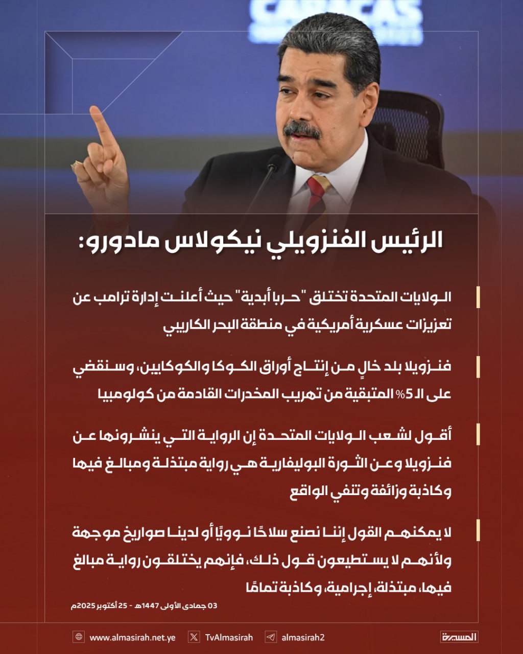 الوصف:شن الرئيس الفنزويلي نيكولاس مادورو هجوماً لاذعاً على الولايات المتحدة، متهماً إياها باختلاق ذرائع كاذبة لتبرير تصعيد عسكري في المنطقة، وذلك عقب إعلان إدارة الرئيس الأمريكي ترامب عن تعزيزات عسكرية أمريكية في منطقة البحر الكاريبي.