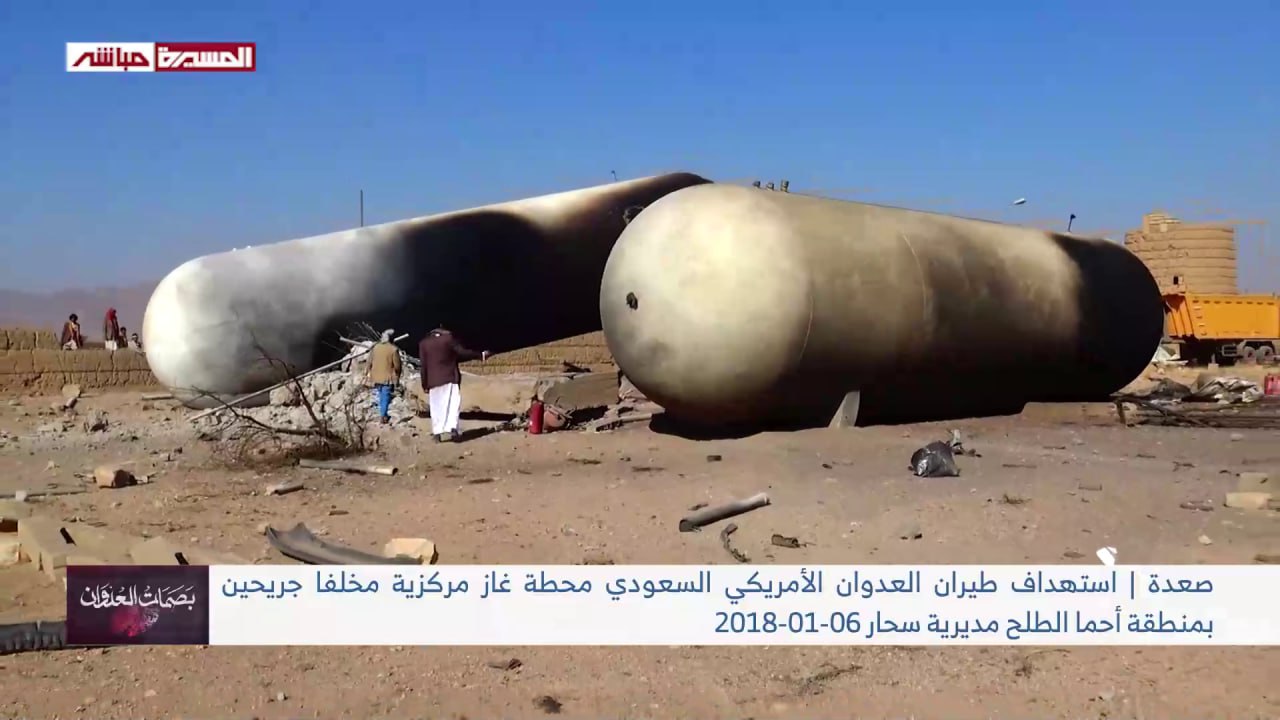 وفي جريمة أخرى، استهدف طيران العدوان محطة غاز مركزية في منطقة أحما الطلح