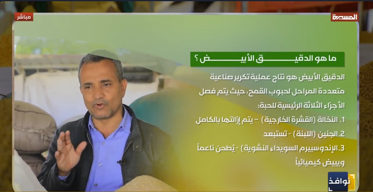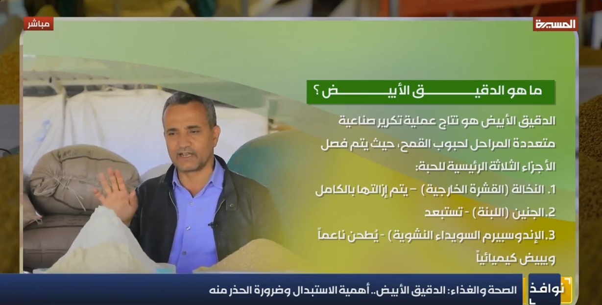 الوصف:المسيرة نت | تقرير: في الوقت الذي يواجه فيه المجتمع اليمني تحديات صحية متزايدة، دقت فقرة "الصحة والغذاء" في برنامج "نوافذ" ناقوس الخطر تجاه مادة "الدقيق الأبيض"، واصفة إياها بالدخيل المرعب الذي بات يفتك بصحة الأجيال، وعبر رؤية علمية تحليلية، كشف الدكتور محمد عبدالقادر، عن الحقائق المخفية خلف هذه المادة التي جُردت من قيمتها الغذائية لتتحول إلى مصدر للأمراض المزمنة.